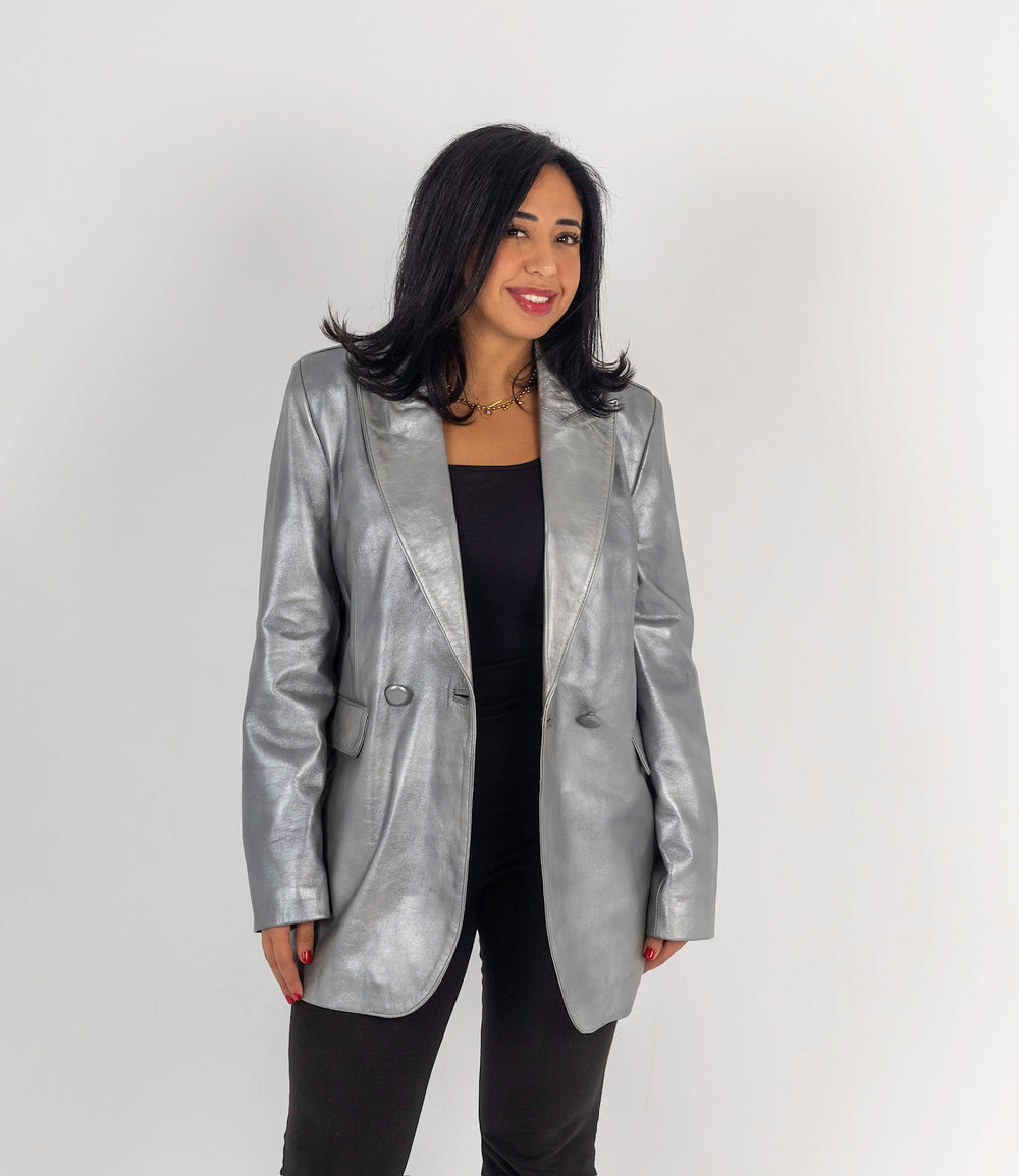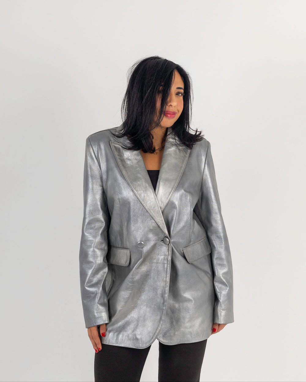 The Genuine Grace Metallic Silver Leather Blazer redefines bold elegance with a fresh twist on our signature silhouette. this piece features a double-breasted design with two rows of buttons.